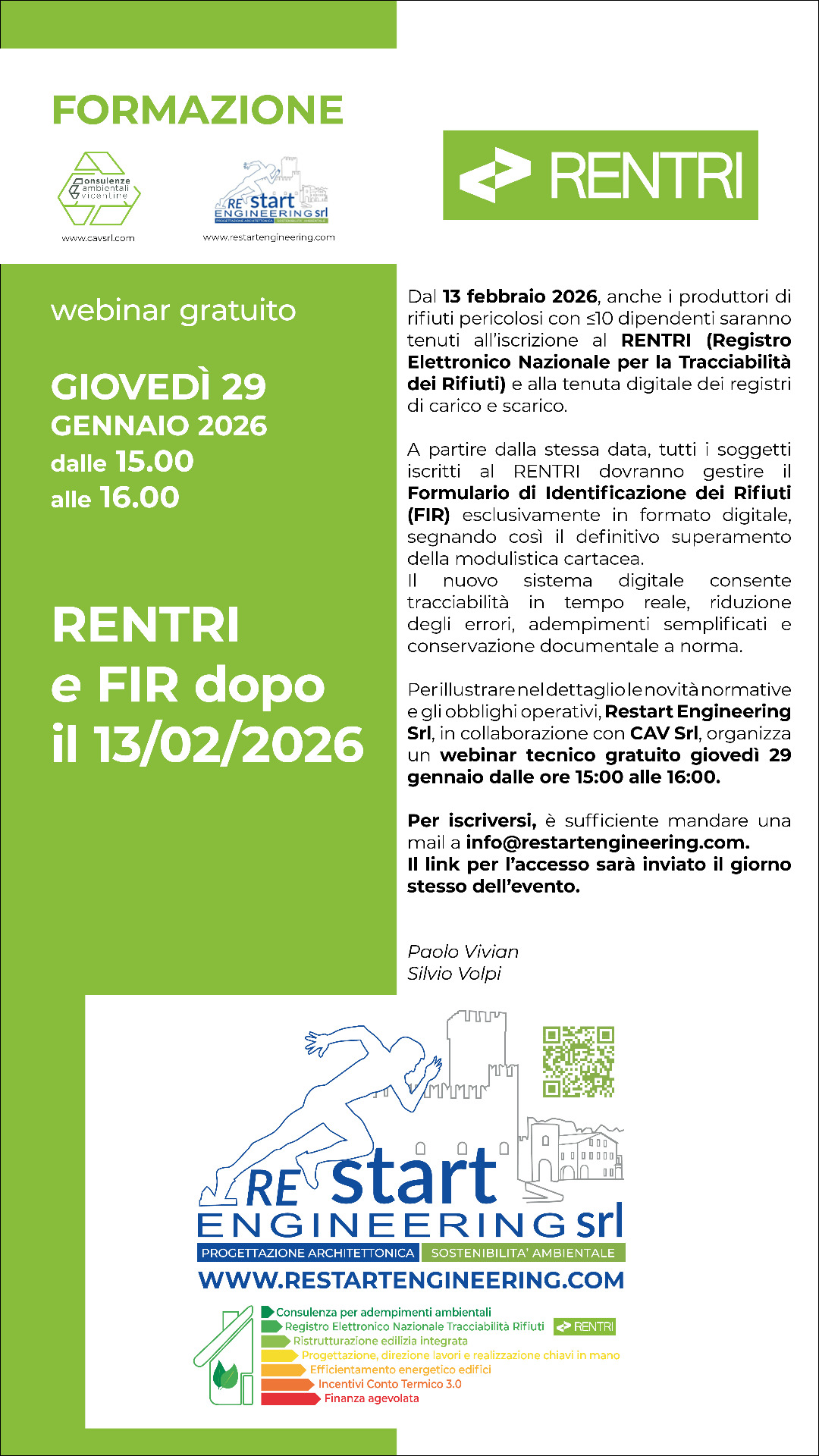 a seguito del webinar "RENTRI e FIR Digitale: cosa cambia dal 13 febbraio 2026 per le aziende", tenutosi ieri, 29 gennaio 2026 in collaborazione con Restart Engineering Srl, trasmettiamo in allegato le slide presentate durante l'incontro.